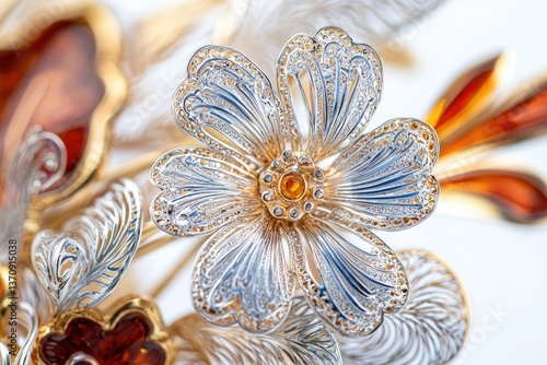 A close-up shows an elegant, ornate silver and gold flower with delicate filigree details and amber-colored accents.