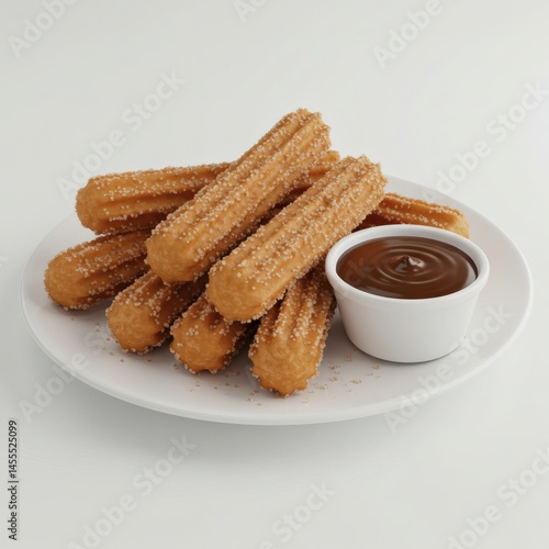 A closeup shows delicious sweet churros, a tasty pastry snack, isolated on a white plate