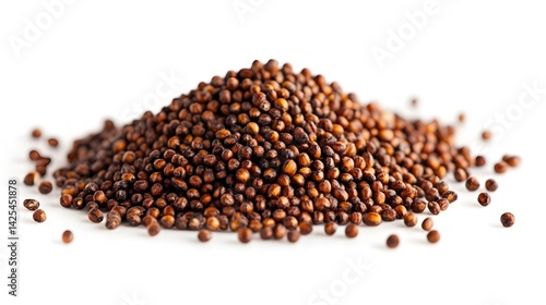 A close-up studio shot shows a small pile of dark brown quinoa seeds against a bright white background.