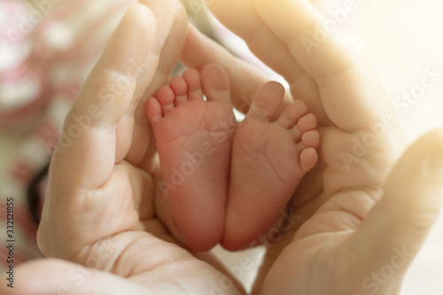 A close-up tiny baby feet. Childcare, safety and education concept.