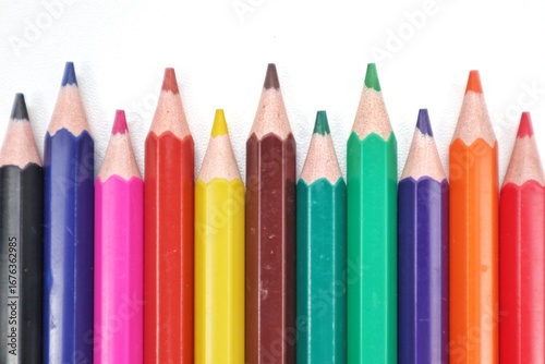 A close-up, top-down view of a vibrant array of colorful wooden pencils, fanned out to display their diverse hues, ideal for art, education, or creativity themes.