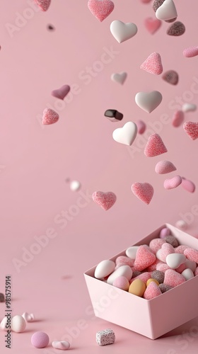 A close-up view captures a candy box brimming with a variety of colorful sweets, arranged beautifully on a pastel pink surface, inviting a sense of joy and nostalgia.