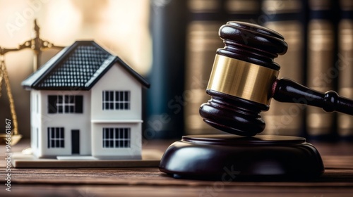 A closeup view features a judge's gavel next to a small house model, symbolizing the connection between law and real estate in a legal environment filled with books