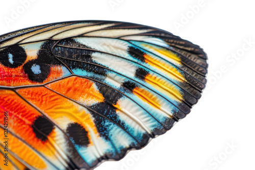 A close-up view of a beautifully colored butterfly wing showcasing intricate patterns and vibrant hues against a soft white background isolated on transparent background