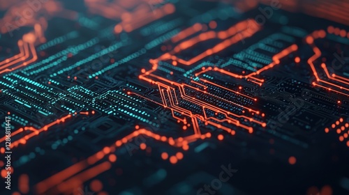 A close-up view of a circuit board featuring vibrant blue and orange patterns, showcasing intricate electronic pathways and connections.