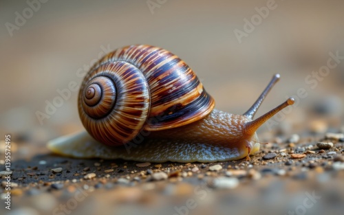 A close-up view of a colorful snail with a spiral shell, slowly moving over a textured surface