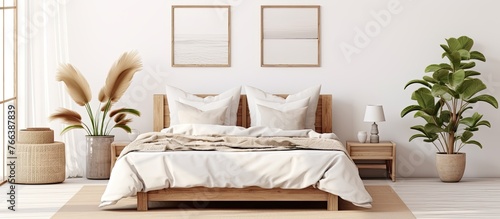 A close-up view of a comfortable bed, showcasing soft pillows and a warm blanket in a well-decorated room