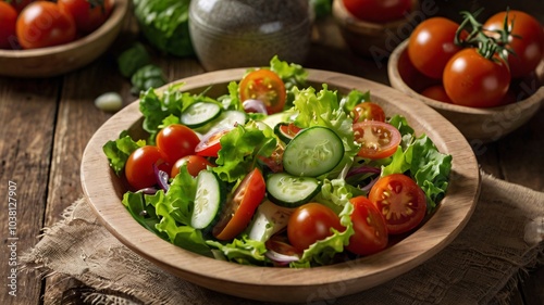 A close-up view of a fresh, colorful salad with various vegetables like tomatoes, cucumbers, and lettuce served in a wooden bowl on a rustic table