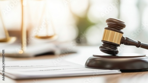 A close-up view of a gavel resting on legal documents with scales of justice in the background, symbolizing law, justice, and the legal system.