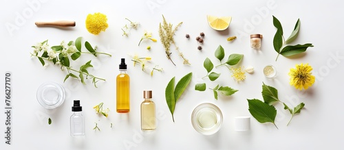 A close-up view of a glass bottle containing essential oils, surrounded by various types of blooming flowers in full bloom.