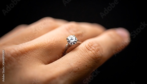 A close-up view of a gleaming diamond engagement ring on a hand against a dark background.
