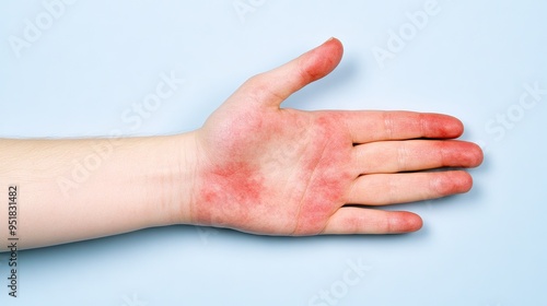 A close-up view of a hand displaying red spots, nestled against a soft pale blue backdrop, evocative of skin reactions or conditions