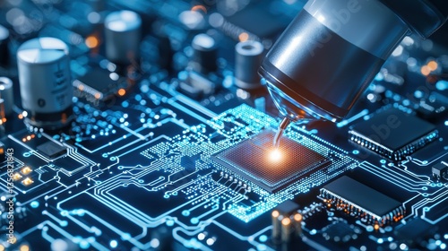 A close-up view of a microprocessor on a circuit board, highlighting intricate details and glowing components associated with technology and electronics.