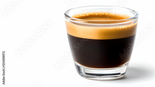 A close-up view of a perfectly layered espresso shot, showcasing rich crema on top of dark, bold coffee.