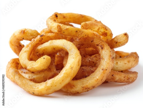 A close-up view of a pile of crispy, seasoned spiral-cut potato fries against a plain white background.