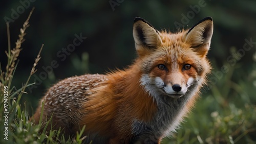 A Close-Up View of a Red Fox Standing in a Lush Green Meadow During Early Morning Hours
