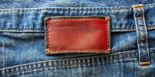 A close-up view of a red leather patch stitched onto a denim fabric with visible stitching