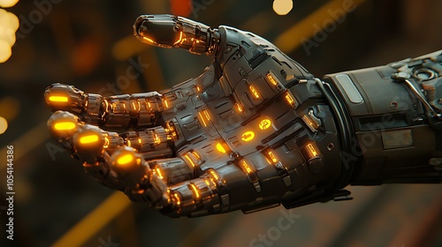 A close-up view of a robotic hand with glowing orange lights. The hand is made of metal and has a complex design.