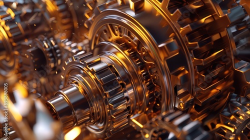 A close-up view of a series of interlocking metal gears, reflecting a warm, golden light
