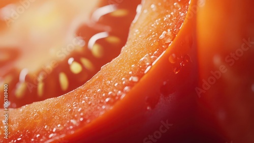A close-up view of a sliced tomato, showcasing its vibrant color.