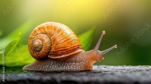 A close-up view of a snail gliding on a leaf showcases its intricate shell and soft body, highlighting the beauty of nature's creatures and their slow pace.