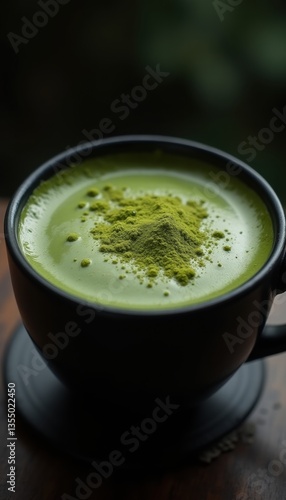 A close-up view of a steaming cup of vibrant green matcha tea, showcasing its rich texture and fine powder, perfect for wellness and beverage-related content.