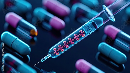 A close-up view of a syringe filled with a colorful liquid, surrounded by various capsules, representing medical and pharmaceutical themes.