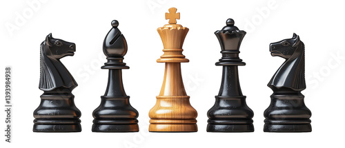 A close-up view of a wooden king chess piece surrounded by black knight and bishop pieces, symbolizing strategy