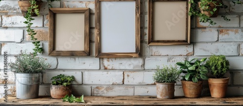 A close-up view of a wooden shelf holding three picture frames with green plants, adding a touch of nature indoors