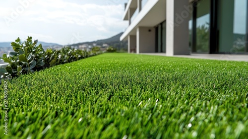 A close-up view of artificial grass on a balcony with a modern building backdrop.