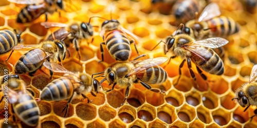 A close-up view of bees working diligently on a honeycomb, their fuzzy bodies and delicate wings contrasting sharply with the golden wax structure.