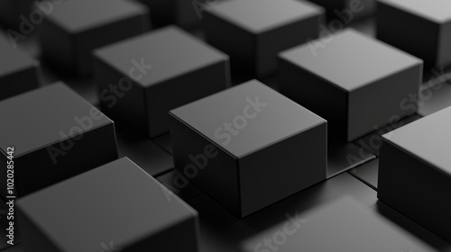 A close-up view of black cubes arranged on a surface highlighting texture and depth in a minimalist design
