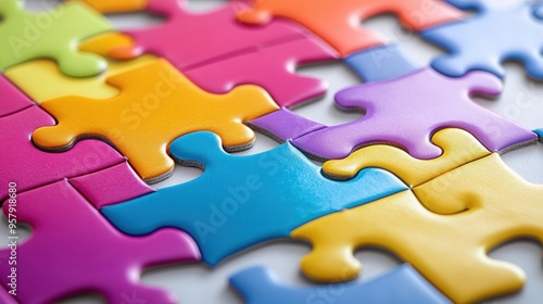 A close-up view of brightly colored puzzle pieces interlocking, showcasing the detailed texture and vibrant colors, perfect for representing teamwork, creativity, and problem-solving.