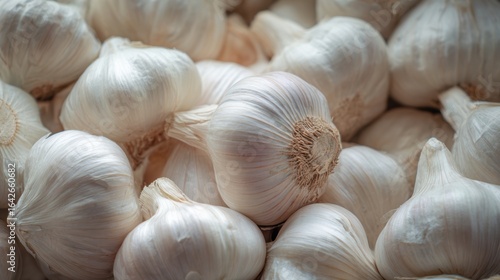 A close-up view of fresh garlic bulbs, showcasing their papery skin and unique shape, arranged in a natural setting.
