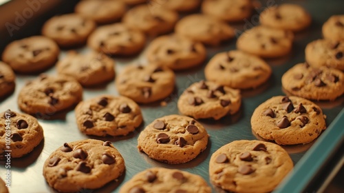 A close-up view of freshly baked chocolate chip cookies cooling on a metal tray, perfect for culinary and baking themes.