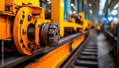 A close-up view of industrial machinery featuring a yellow component on tracks, emphasizing precision and engineering in a factory setting.