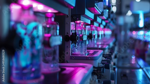 A close-up view of laboratory vials illuminated with vibrant colors, showcasing advanced technology in a modern research facility.