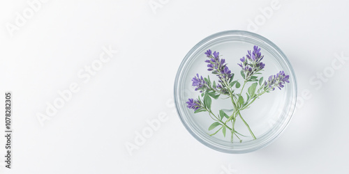 A close-up view of lavender sprigs submerged in water inside a glass bowl, presenting a serene and calming arrangement suitable for wellness themes.