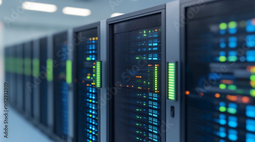 A close-up view of modern server racks with illuminated indicators, showcasing a high-tech data center environment.