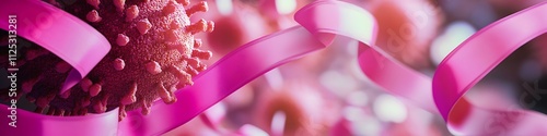 A close-up view of pink ribbons and abstract cancer cells creating a striking contrast