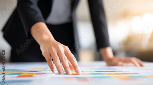 A closeup view of professional's hand pointing at financial data report with colorful charts and graphs during business meeting for strategic analysis planning.