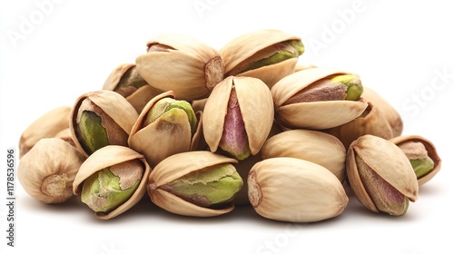 A close-up view of roasted salted pistachios in their shells, showcasing their natural green and brown colors, arranged in a heap on a white background