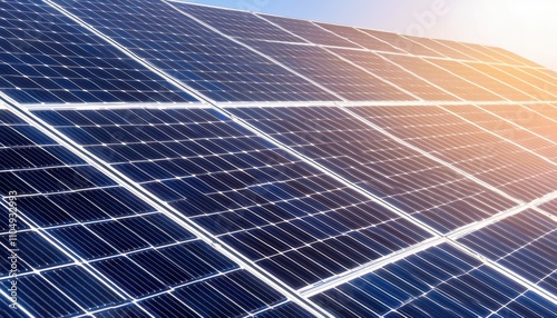 A close-up view of solar panels reflecting sunlight, showcasing their blue surface and grid pattern, symbolizing renewable energy and sustainability.
