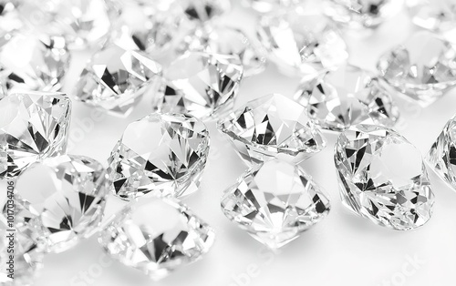 A close-up view of sparkling clear diamonds scattered across a white surface, showcasing their brilliance and multifaceted shapes