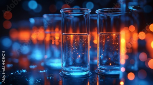 A close-up view of transparent test tubes filled with liquid, illuminated by blue and orange lights.