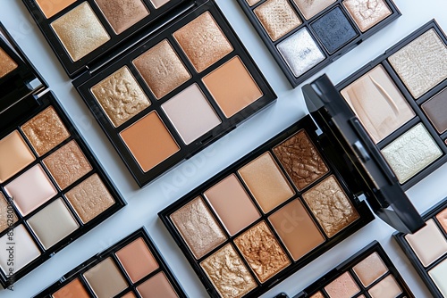 A close-up view of various makeup palettes featuring contouring and highlighting shades. Generative AI
