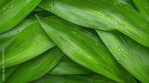 A close-up view of vibrant green leaves adorned with morning dew, showcasing their rich texture and natural beauty. Perfect for nature-themed designs and eco-friendly projects.