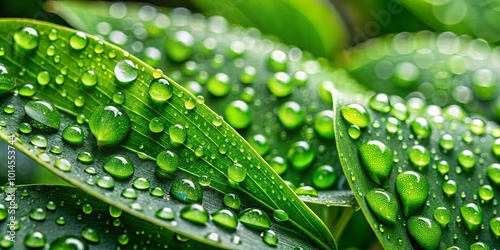 A Close-Up View of Vibrant Green Leaves Covered in Sparkling Dew Drops, Capturing the Beauty of Nature's Simplicity