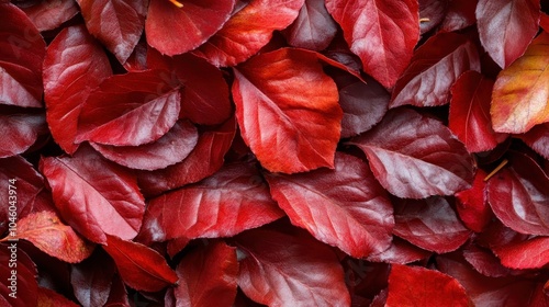 A close-up view of vibrant red leaves creates a rich, textured surface. Each leaf glistens with a natural sheen, capturing the essence of autumn's brilliance.