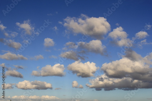a cloudscape of a beautiful blue sky with rows of little white clouds